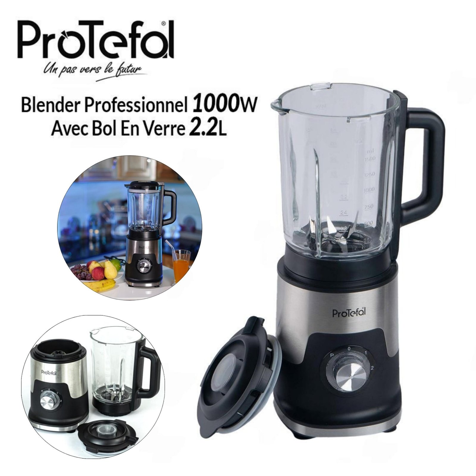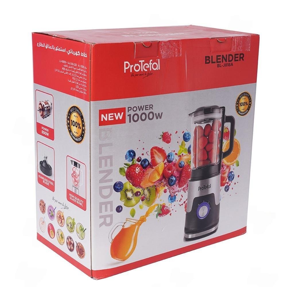 خلاط كهربائي 1000 واط بسعة 2.2 لتر، سرعتان + توربو، 6 شفرات من الستانلس ستيل مع وعاء زجاجي – Protefal BL-J818A