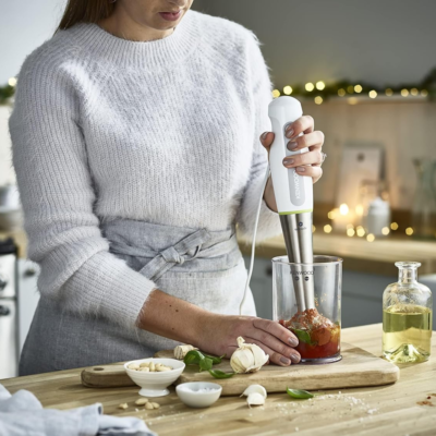 يتيح لك خلاط اليد الغاطس Kenwood Triblade HDP109WG تحضير وصفاتك اليومية بسهولة مثل الشوربات والبيوريه والسموذي والصلصات والفرم السريع. بفضل تقنية Triblade الحاصلة على براءة اختراع ومحرك بقدرة 600 واط (سرعة واحدة + توربو)، يمنحك خلطًا سريعًا ومتجانسًا. يأتي مع قدم معدني قوي مضاد للتناثر، وخفاق بيض من الفولاذ المقاوم للصدأ، ووعاء مفرمة بسعة 0.5 لتر، بالإضافة إلى كأس مدرّج 0.5 لتر. كما يوفّر مقبضًا بملمس مانع للانزلاق لسهولة الإمساك، ومكوّنات قابلة للفك وبعضها قابل للغسل في غسالة الصحون.