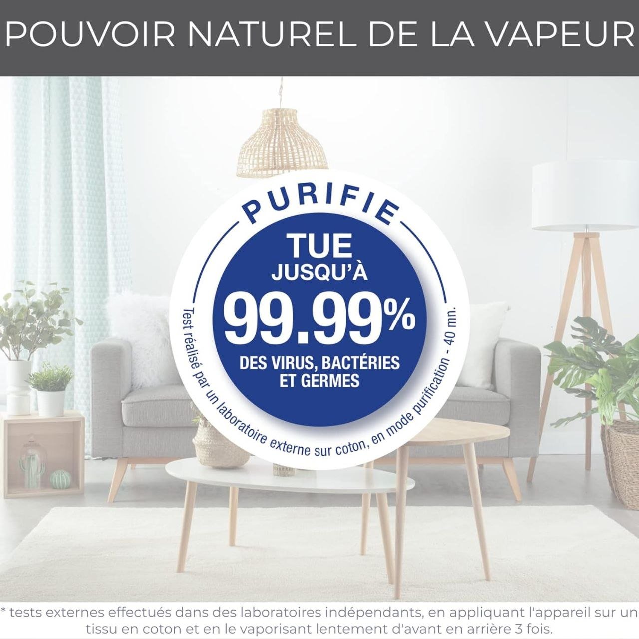 - Purification des germes jusqu’à 99,99 % : La vapeur assainit vos vêtements en éliminant bactéries et odeurs, pour une hygiène renforcée.