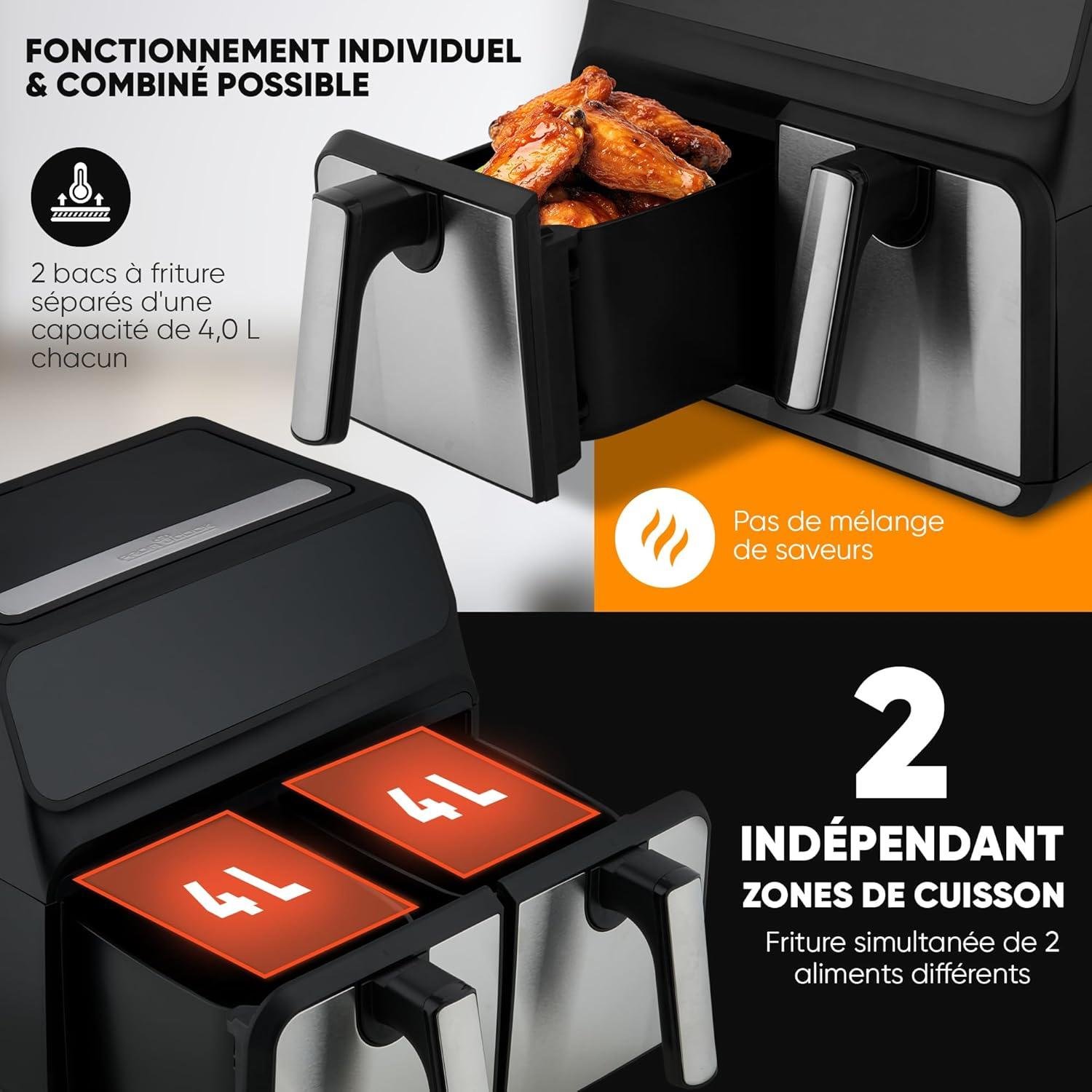 La friteuse sans huile ProfiCook PC-FR 1287 H vous offre une cuisson saine, rapide et efficace grâce à sa technologie à air chaud. Avec une capacité totale de 8 litres (2 x 4L), elle est idéale pour préparer de grands repas ou pour cuisiner différents aliments en même temps, sans mélange de saveurs, grâce à ses deux tiroirs de cuisson indépendants.